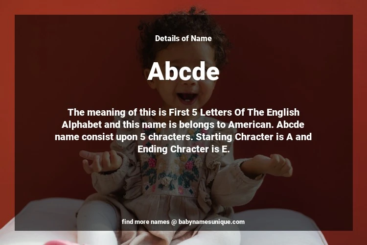 The name Abcde is chosen by those who are willing to find Unique Transgenders Baby Names. The meaning of this is First 5 Letters Of The English Alphabet and this name is belongs to American Origin. Baby Name Abcde consist upon 5 chracters. Starting alphabet is A and ending alphabet is E. This name is used primarily by parents who are considering unique baby names for Transgenders. The Zodiac Sign suitbale for this name are;