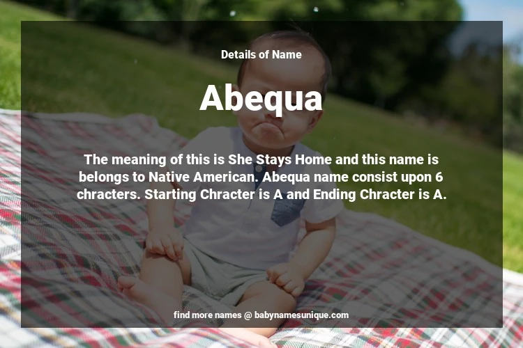 The name Abequa is chosen by those who are willing to find Unique Transgenders Baby Names. The meaning of this is She Stays Home and this name is belongs to Native American Origin. Baby Name Abequa consist upon 6 chracters. Starting alphabet is A and ending alphabet is A. This name is used primarily by parents who are considering unique baby names for Transgenders. The Zodiac Sign suitbale for this name are;