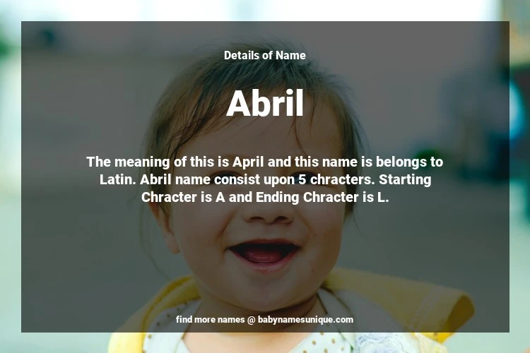 The name Abril is chosen by those who are willing to find Unique Transgenders Baby Names. The meaning of this is April and this name is belongs to Latin Origin. Baby Name Abril consist upon 5 chracters. Starting alphabet is A and ending alphabet is L. This name is used primarily by parents who are considering unique baby names for Transgenders. The Zodiac Sign suitbale for this name are;