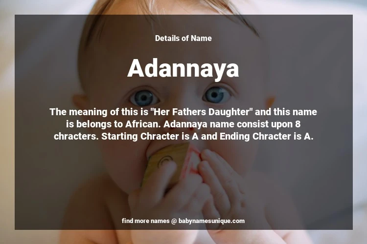 The name Adannaya is chosen by those who are willing to find Unique Transgenders Baby Names. The meaning of this is "Her Fathers Daughter" and this name is belongs to African Origin. Baby Name Adannaya consist upon 8 chracters. Starting alphabet is A and ending alphabet is A. This name is used primarily by parents who are considering unique baby names for Transgenders. The Zodiac Sign suitbale for this name are;