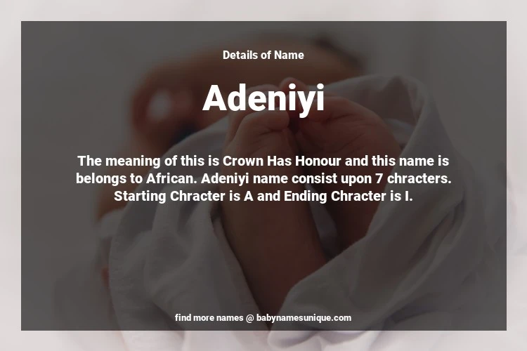 The name Adeniyi is chosen by those who are willing to find Unique Transgenders Baby Names. The meaning of this is Crown Has Honour and this name is belongs to African Origin. Baby Name Adeniyi consist upon 7 chracters. Starting alphabet is A and ending alphabet is I. This name is used primarily by parents who are considering unique baby names for Transgenders. The Zodiac Sign suitbale for this name are;