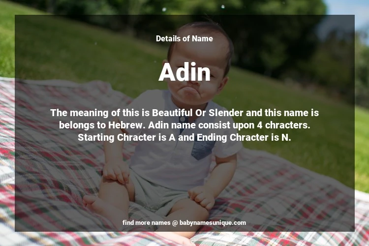 The name Adin is chosen by those who are willing to find Unique Transgenders Baby Names. The meaning of this is Beautiful Or Slender and this name is belongs to Hebrew Origin. Baby Name Adin consist upon 4 chracters. Starting alphabet is A and ending alphabet is N. This name is used primarily by parents who are considering unique baby names for Transgenders. The Zodiac Sign suitbale for this name are;