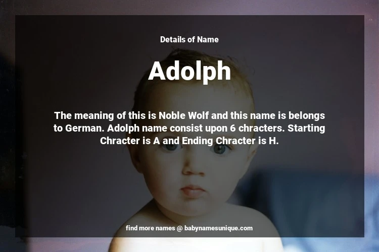 The name Adolph is chosen by those who are willing to find Unique Boy Baby Names. The meaning of this is Noble Wolf and this name is belongs to German Origin. Baby Name Adolph consist upon 6 chracters. Starting alphabet is A and ending alphabet is H. This name is used primarily by parents who are considering unique baby names for Boy. The Zodiac Sign suitbale for this name are;