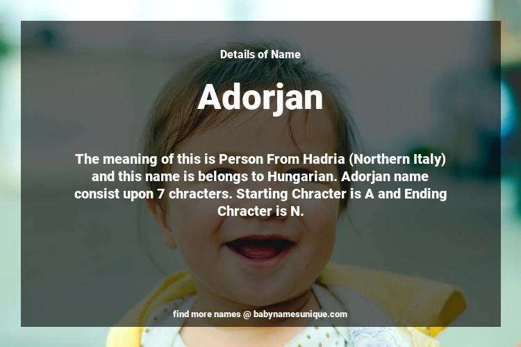 The name Adorjan is chosen by those who are willing to find Unique Boy Baby Names. The meaning of this is Person From Hadria (Northern Italy) and this name is belongs to Hungarian Origin. Baby Name Adorjan consist upon 7 chracters. Starting alphabet is A and ending alphabet is N. This name is used primarily by parents who are considering unique baby names for Boy. The Zodiac Sign suitbale for this name are;