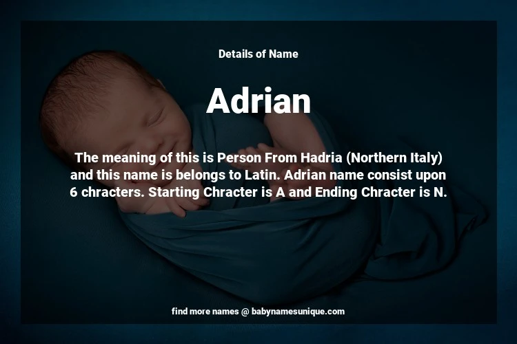 The name Adrian is chosen by those who are willing to find Unique Boy Baby Names. The meaning of this is Person From Hadria (Northern Italy) and this name is belongs to Latin Origin. Baby Name Adrian consist upon 6 chracters. Starting alphabet is A and ending alphabet is N. This name is used primarily by parents who are considering unique baby names for Boy. The Zodiac Sign suitbale for this name are;