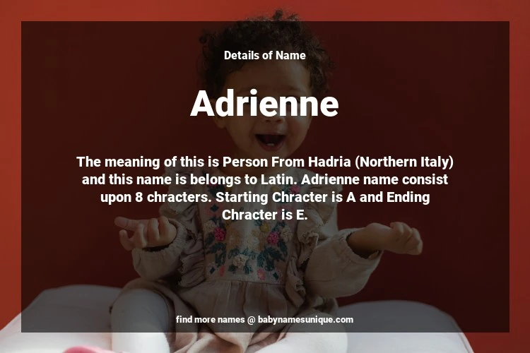 The name Adrienne is chosen by those who are willing to find Unique Transgenders Baby Names. The meaning of this is Person From Hadria (Northern Italy) and this name is belongs to Latin Origin. Baby Name Adrienne consist upon 8 chracters. Starting alphabet is A and ending alphabet is E. This name is used primarily by parents who are considering unique baby names for Transgenders. The Zodiac Sign suitbale for this name are;