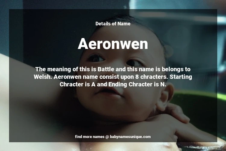 The name Aeronwen is chosen by those who are willing to find Unique Transgenders Baby Names. The meaning of this is Battle and this name is belongs to Welsh Origin. Baby Name Aeronwen consist upon 8 chracters. Starting alphabet is A and ending alphabet is N. This name is used primarily by parents who are considering unique baby names for Transgenders. The Zodiac Sign suitbale for this name are;
