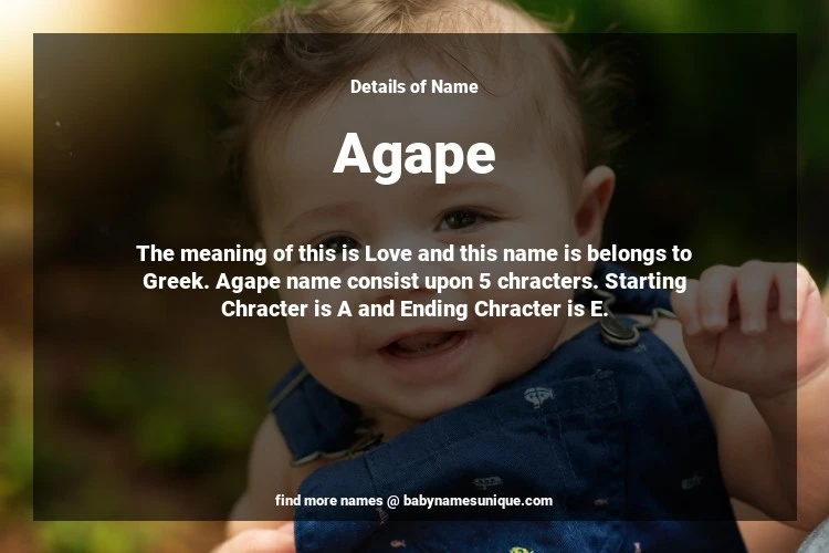 The name Agape is chosen by those who are willing to find Unique Transgenders Baby Names. The meaning of this is Love and this name is belongs to Greek Origin. Baby Name Agape consist upon 5 chracters. Starting alphabet is A and ending alphabet is E. This name is used primarily by parents who are considering unique baby names for Transgenders. The Zodiac Sign suitbale for this name are;