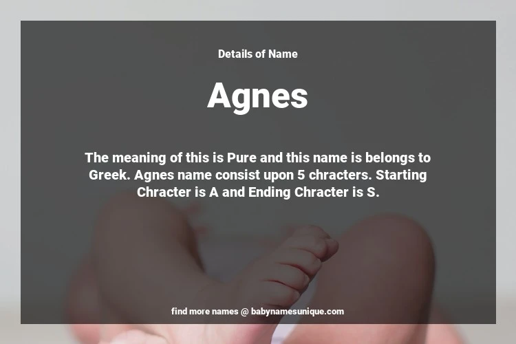 The name Agnes is chosen by those who are willing to find Unique Transgenders Baby Names. The meaning of this is Pure and this name is belongs to Greek Origin. Baby Name Agnes consist upon 5 chracters. Starting alphabet is A and ending alphabet is S. This name is used primarily by parents who are considering unique baby names for Transgenders. The Zodiac Sign suitbale for this name are;