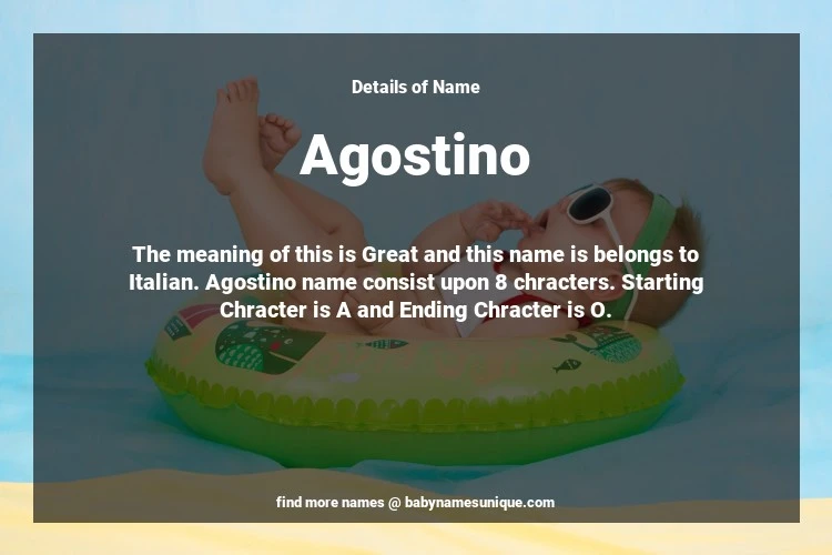 The name Agostino is chosen by those who are willing to find Unique Boy Baby Names. The meaning of this is Great and this name is belongs to Italian Origin. Baby Name Agostino consist upon 8 chracters. Starting alphabet is A and ending alphabet is O. This name is used primarily by parents who are considering unique baby names for Boy. The Zodiac Sign suitbale for this name are;