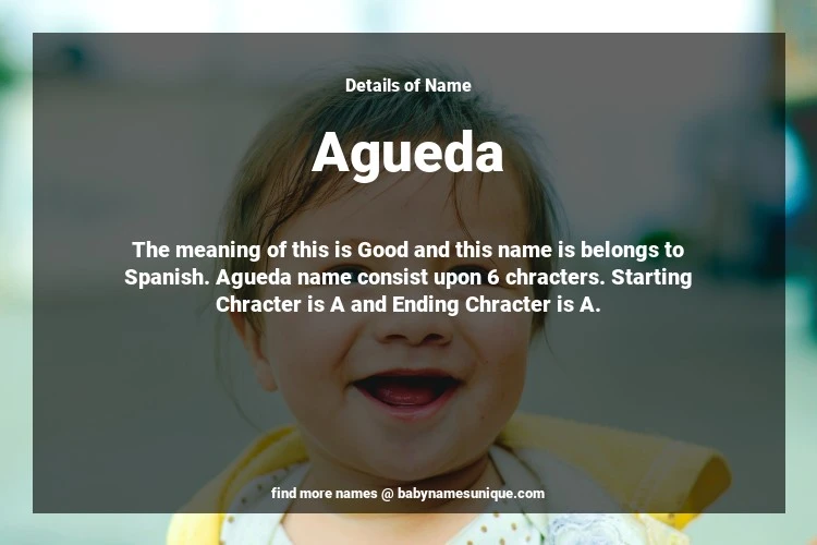 The name Agueda is chosen by those who are willing to find Unique Transgenders Baby Names. The meaning of this is Good and this name is belongs to Spanish Origin. Baby Name Agueda consist upon 6 chracters. Starting alphabet is A and ending alphabet is A. This name is used primarily by parents who are considering unique baby names for Transgenders. The Zodiac Sign suitbale for this name are;