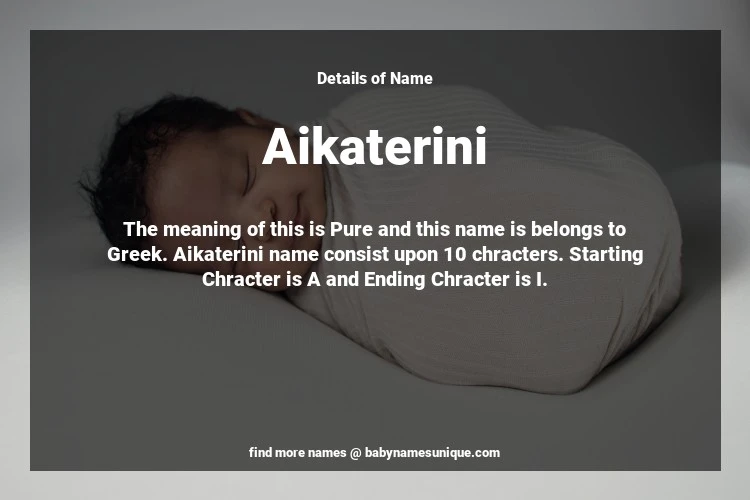 The name Aikaterini is chosen by those who are willing to find Unique Transgenders Baby Names. The meaning of this is Pure and this name is belongs to Greek Origin. Baby Name Aikaterini consist upon 10 chracters. Starting alphabet is A and ending alphabet is I. This name is used primarily by parents who are considering unique baby names for Transgenders. The Zodiac Sign suitbale for this name are;
