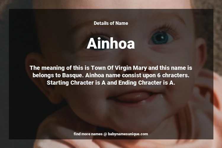 The name Ainhoa is chosen by those who are willing to find Unique Transgenders Baby Names. The meaning of this is Town Of Virgin Mary and this name is belongs to Basque Origin. Baby Name Ainhoa consist upon 6 chracters. Starting alphabet is A and ending alphabet is A. This name is used primarily by parents who are considering unique baby names for Transgenders. The Zodiac Sign suitbale for this name are;