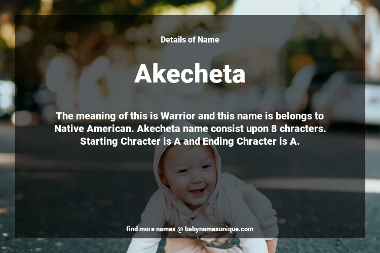 The name Akecheta is chosen by those who are willing to find Unique Boy Baby Names. The meaning of this is Warrior and this name is belongs to Native American Origin. Baby Name Akecheta consist upon 8 chracters. Starting alphabet is A and ending alphabet is A. This name is used primarily by parents who are considering unique baby names for Boy. The Zodiac Sign suitbale for this name are;