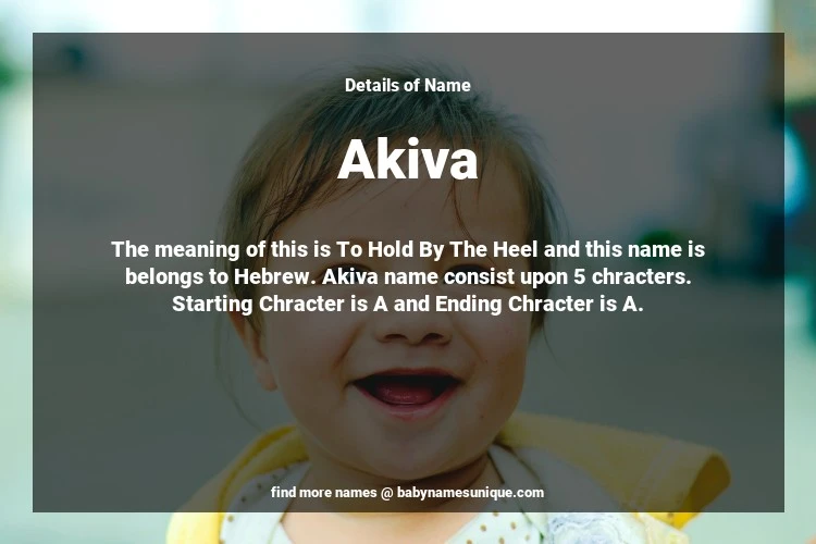 The name Akiva is chosen by those who are willing to find Unique Boy Baby Names. The meaning of this is To Hold By The Heel and this name is belongs to Hebrew Origin. Baby Name Akiva consist upon 5 chracters. Starting alphabet is A and ending alphabet is A. This name is used primarily by parents who are considering unique baby names for Boy. The Zodiac Sign suitbale for this name are;