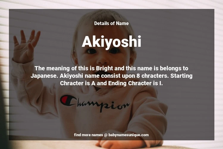 The name Akiyoshi is chosen by those who are willing to find Unique Boy Baby Names. The meaning of this is Bright and this name is belongs to Japanese Origin. Baby Name Akiyoshi consist upon 8 chracters. Starting alphabet is A and ending alphabet is I. This name is used primarily by parents who are considering unique baby names for Boy. The Zodiac Sign suitbale for this name are;