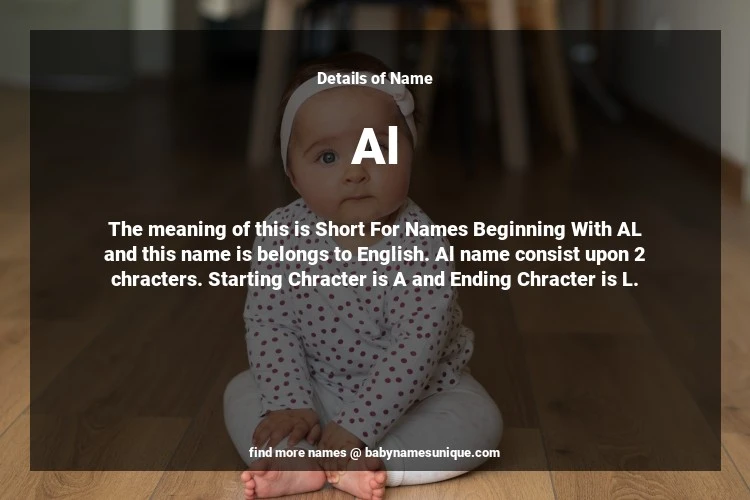 The name Al is chosen by those who are willing to find Unique Boy Baby Names. The meaning of this is Short For Names Beginning With AL and this name is belongs to English Origin. Baby Name Al consist upon 2 chracters. Starting alphabet is A and ending alphabet is L. This name is used primarily by parents who are considering unique baby names for Boy. The Zodiac Sign suitbale for this name are;