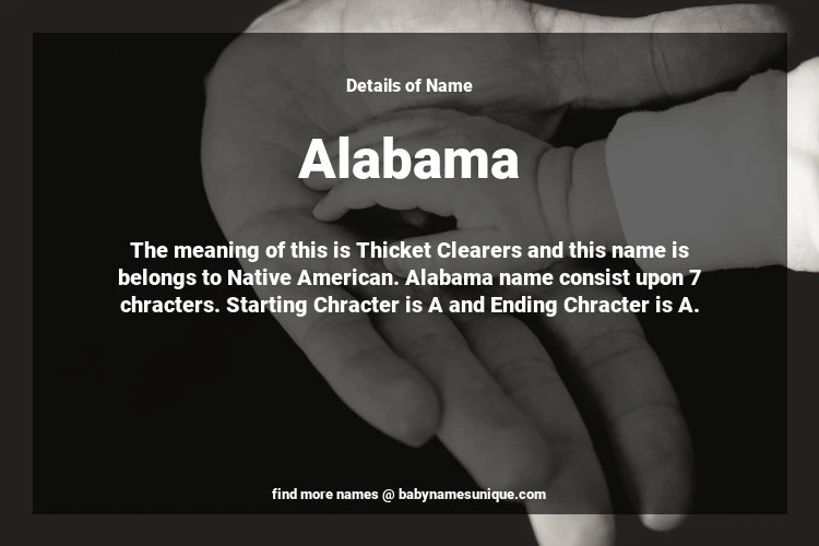 The name Alabama is chosen by those who are willing to find Unique Transgenders Baby Names. The meaning of this is Thicket Clearers and this name is belongs to Native American Origin. Baby Name Alabama consist upon 7 chracters. Starting alphabet is A and ending alphabet is A. This name is used primarily by parents who are considering unique baby names for Transgenders. The Zodiac Sign suitbale for this name are;