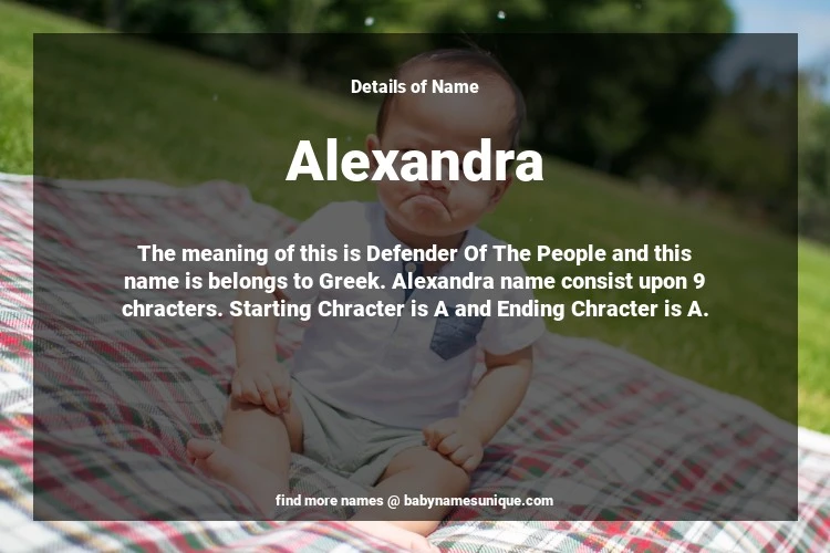 The name Alexandra is chosen by those who are willing to find Unique Transgenders Baby Names. The meaning of this is Defender Of The People and this name is belongs to Greek Origin. Baby Name Alexandra consist upon 9 chracters. Starting alphabet is A and ending alphabet is A. This name is used primarily by parents who are considering unique baby names for Transgenders. The Zodiac Sign suitbale for this name are;