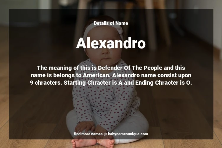 The name Alexandro is chosen by those who are willing to find Unique Boy Baby Names. The meaning of this is Defender Of The People and this name is belongs to American Origin. Baby Name Alexandro consist upon 9 chracters. Starting alphabet is A and ending alphabet is O. This name is used primarily by parents who are considering unique baby names for Boy. The Zodiac Sign suitbale for this name are;