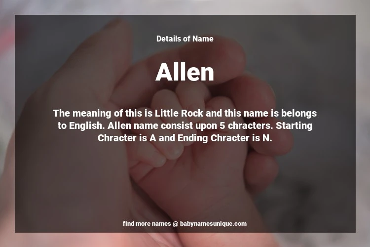 The name Allen is chosen by those who are willing to find Unique Boy Baby Names. The meaning of this is Little Rock and this name is belongs to English Origin. Baby Name Allen consist upon 5 chracters. Starting alphabet is A and ending alphabet is N. This name is used primarily by parents who are considering unique baby names for Boy. The Zodiac Sign suitbale for this name are;