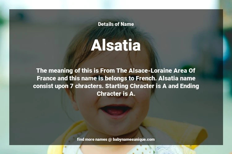 The name Alsatia is chosen by those who are willing to find Unique Transgenders Baby Names. The meaning of this is From The Alsace-Loraine Area Of France and this name is belongs to French Origin. Baby Name Alsatia consist upon 7 chracters. Starting alphabet is A and ending alphabet is A. This name is used primarily by parents who are considering unique baby names for Transgenders. The Zodiac Sign suitbale for this name are;