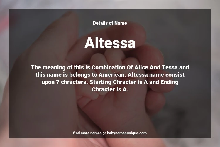 The name Altessa is chosen by those who are willing to find Unique Transgenders Baby Names. The meaning of this is Combination Of Alice And Tessa and this name is belongs to American Origin. Baby Name Altessa consist upon 7 chracters. Starting alphabet is A and ending alphabet is A. This name is used primarily by parents who are considering unique baby names for Transgenders. The Zodiac Sign suitbale for this name are;