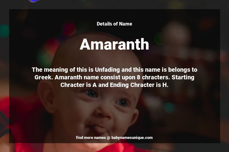 The name Amaranth is chosen by those who are willing to find Unique Transgenders Baby Names. The meaning of this is Unfading and this name is belongs to Greek Origin. Baby Name Amaranth consist upon 8 chracters. Starting alphabet is A and ending alphabet is H. This name is used primarily by parents who are considering unique baby names for Transgenders. The Zodiac Sign suitbale for this name are;