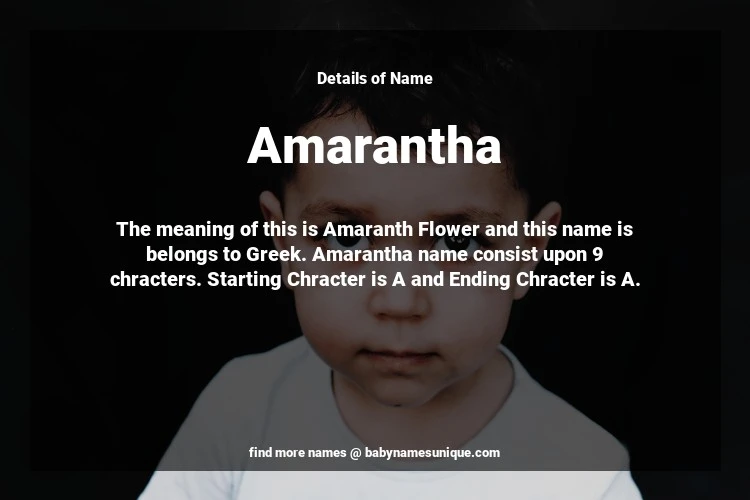 The name Amarantha is chosen by those who are willing to find Unique Transgenders Baby Names. The meaning of this is Amaranth Flower and this name is belongs to Greek Origin. Baby Name Amarantha consist upon 9 chracters. Starting alphabet is A and ending alphabet is A. This name is used primarily by parents who are considering unique baby names for Transgenders. The Zodiac Sign suitbale for this name are;