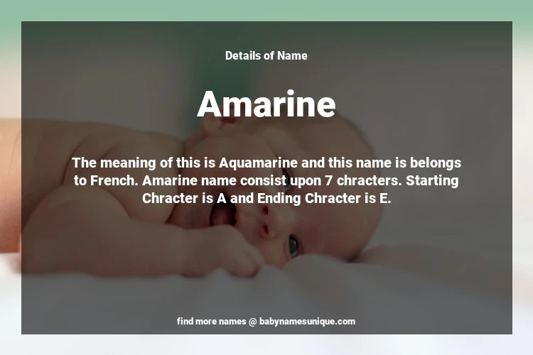 The name Amarine is chosen by those who are willing to find Unique Transgenders Baby Names. The meaning of this is Aquamarine and this name is belongs to French Origin. Baby Name Amarine consist upon 7 chracters. Starting alphabet is A and ending alphabet is E. This name is used primarily by parents who are considering unique baby names for Transgenders. The Zodiac Sign suitbale for this name are;