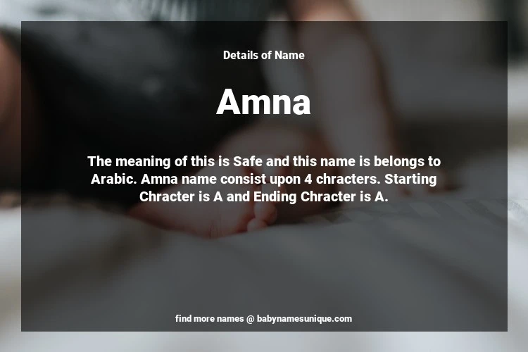 The name Amna is chosen by those who are willing to find Unique Transgenders Baby Names. The meaning of this is Safe and this name is belongs to Arabic Origin. Baby Name Amna consist upon 4 chracters. Starting alphabet is A and ending alphabet is A. This name is used primarily by parents who are considering unique baby names for Transgenders. The Zodiac Sign suitbale for this name are;