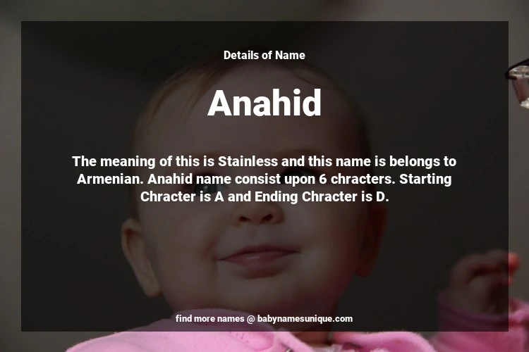 The name Anahid is chosen by those who are willing to find Unique Transgenders Baby Names. The meaning of this is Stainless and this name is belongs to Armenian Origin. Baby Name Anahid consist upon 6 chracters. Starting alphabet is A and ending alphabet is D. This name is used primarily by parents who are considering unique baby names for Transgenders. The Zodiac Sign suitbale for this name are;