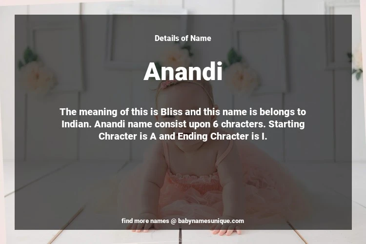 The name Anandi is chosen by those who are willing to find Unique Transgenders Baby Names. The meaning of this is Bliss and this name is belongs to Indian Origin. Baby Name Anandi consist upon 6 chracters. Starting alphabet is A and ending alphabet is I. This name is used primarily by parents who are considering unique baby names for Transgenders. The Zodiac Sign suitbale for this name are;