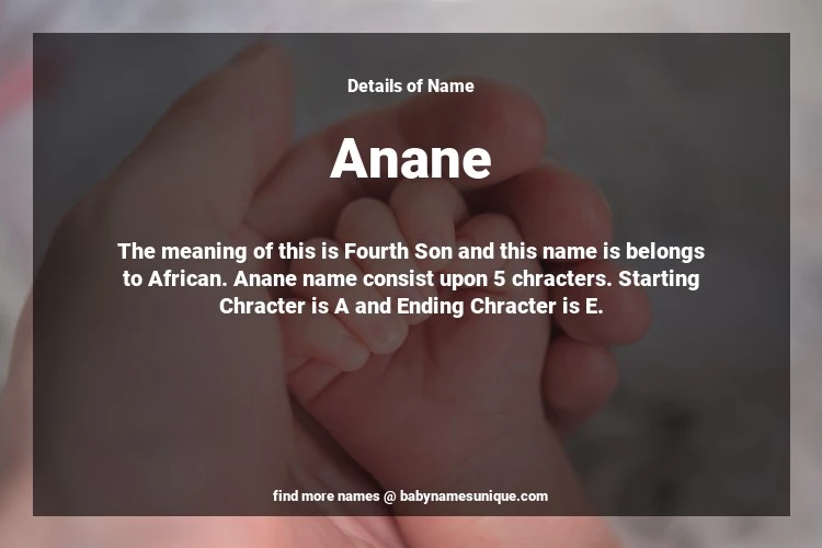 The name Anane is chosen by those who are willing to find Unique Boy Baby Names. The meaning of this is Fourth Son and this name is belongs to African Origin. Baby Name Anane consist upon 5 chracters. Starting alphabet is A and ending alphabet is E. This name is used primarily by parents who are considering unique baby names for Boy. The Zodiac Sign suitbale for this name are;