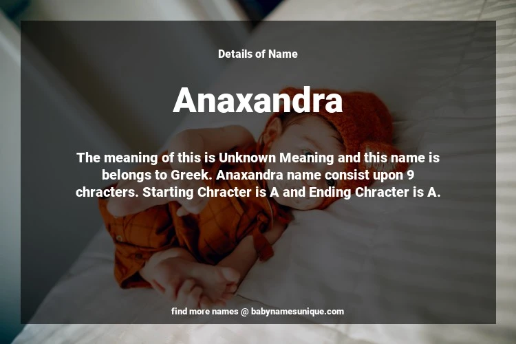 The name Anaxandra is chosen by those who are willing to find Unique Transgenders Baby Names. The meaning of this is Unknown Meaning and this name is belongs to Greek Origin. Baby Name Anaxandra consist upon 9 chracters. Starting alphabet is A and ending alphabet is A. This name is used primarily by parents who are considering unique baby names for Transgenders. The Zodiac Sign suitbale for this name are;