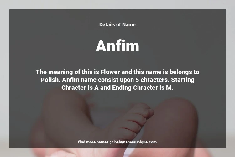 The name Anfim is chosen by those who are willing to find Unique Boy Baby Names. The meaning of this is Flower and this name is belongs to Polish Origin. Baby Name Anfim consist upon 5 chracters. Starting alphabet is A and ending alphabet is M. This name is used primarily by parents who are considering unique baby names for Boy. The Zodiac Sign suitbale for this name are;