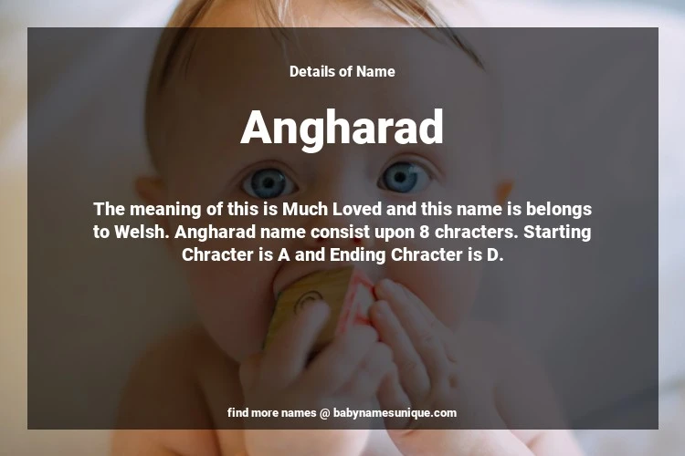 The name Angharad is chosen by those who are willing to find Unique Transgenders Baby Names. The meaning of this is Much Loved and this name is belongs to Welsh Origin. Baby Name Angharad consist upon 8 chracters. Starting alphabet is A and ending alphabet is D. This name is used primarily by parents who are considering unique baby names for Transgenders. The Zodiac Sign suitbale for this name are;