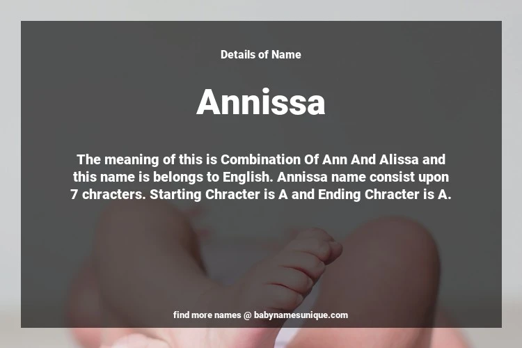 The name Annissa is chosen by those who are willing to find Unique Transgenders Baby Names. The meaning of this is Combination Of Ann And Alissa and this name is belongs to English Origin. Baby Name Annissa consist upon 7 chracters. Starting alphabet is A and ending alphabet is A. This name is used primarily by parents who are considering unique baby names for Transgenders. The Zodiac Sign suitbale for this name are;