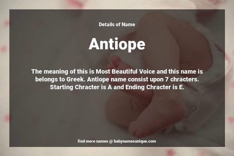 The name Antiope is chosen by those who are willing to find Unique Transgenders Baby Names. The meaning of this is Most Beautiful Voice and this name is belongs to Greek Origin. Baby Name Antiope consist upon 7 chracters. Starting alphabet is A and ending alphabet is E. This name is used primarily by parents who are considering unique baby names for Transgenders. The Zodiac Sign suitbale for this name are;