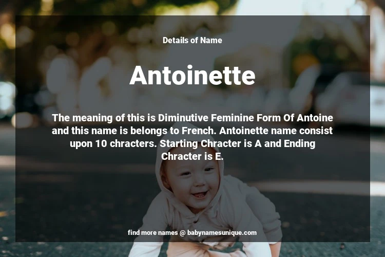 The name Antoinette is chosen by those who are willing to find Unique Transgenders Baby Names. The meaning of this is Diminutive Feminine Form Of Antoine and this name is belongs to French Origin. Baby Name Antoinette consist upon 10 chracters. Starting alphabet is A and ending alphabet is E. This name is used primarily by parents who are considering unique baby names for Transgenders. The Zodiac Sign suitbale for this name are;