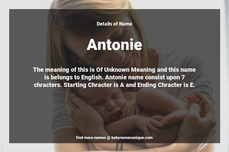 The name Antonie is chosen by those who are willing to find Unique Transgenders Baby Names. The meaning of this is Of Unknown Meaning and this name is belongs to English Origin. Baby Name Antonie consist upon 7 chracters. Starting alphabet is A and ending alphabet is E. This name is used primarily by parents who are considering unique baby names for Transgenders. The Zodiac Sign suitbale for this name are;