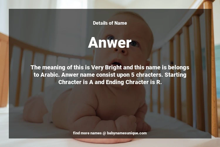 The name Anwer is chosen by those who are willing to find Unique Boy Baby Names. The meaning of this is Very Bright and this name is belongs to Arabic Origin. Baby Name Anwer consist upon 5 chracters. Starting alphabet is A and ending alphabet is R. This name is used primarily by parents who are considering unique baby names for Boy. The Zodiac Sign suitbale for this name are;