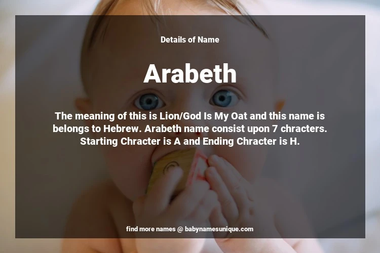 The name Arabeth is chosen by those who are willing to find Unique Transgenders Baby Names. The meaning of this is Lion/God Is My Oat and this name is belongs to Hebrew Origin. Baby Name Arabeth consist upon 7 chracters. Starting alphabet is A and ending alphabet is H. This name is used primarily by parents who are considering unique baby names for Transgenders. The Zodiac Sign suitbale for this name are;