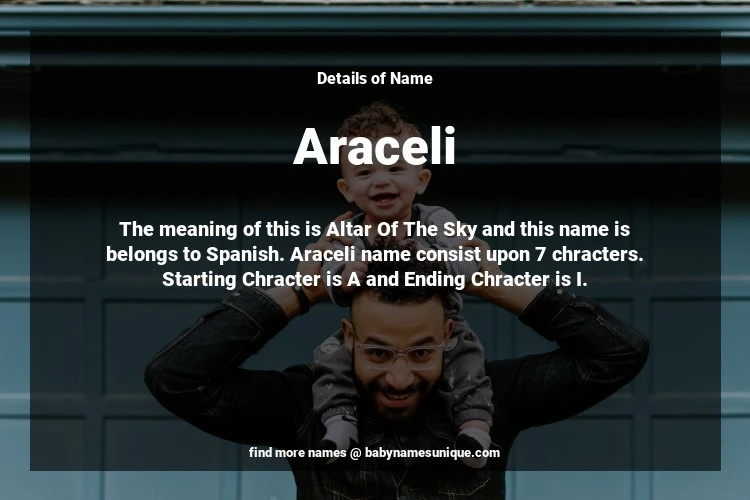 The name Araceli is chosen by those who are willing to find Unique Transgenders Baby Names. The meaning of this is Altar Of The Sky and this name is belongs to Spanish Origin. Baby Name Araceli consist upon 7 chracters. Starting alphabet is A and ending alphabet is I. This name is used primarily by parents who are considering unique baby names for Transgenders. The Zodiac Sign suitbale for this name are;