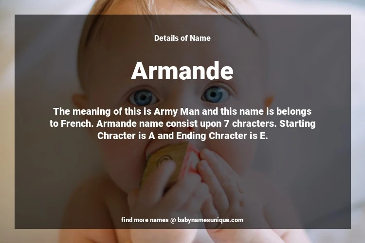 The name Armande is chosen by those who are willing to find Unique Transgenders Baby Names. The meaning of this is Army Man and this name is belongs to French Origin. Baby Name Armande consist upon 7 chracters. Starting alphabet is A and ending alphabet is E. This name is used primarily by parents who are considering unique baby names for Transgenders. The Zodiac Sign suitbale for this name are;