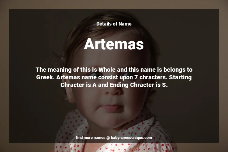 The name Artemas is chosen by those who are willing to find Unique Boy Baby Names. The meaning of this is Whole and this name is belongs to Greek Origin. Baby Name Artemas consist upon 7 chracters. Starting alphabet is A and ending alphabet is S. This name is used primarily by parents who are considering unique baby names for Boy. The Zodiac Sign suitbale for this name are;