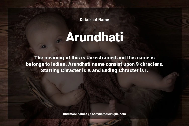 The name Arundhati is chosen by those who are willing to find Unique Transgenders Baby Names. The meaning of this is Unrestrained and this name is belongs to Indian Origin. Baby Name Arundhati consist upon 9 chracters. Starting alphabet is A and ending alphabet is I. This name is used primarily by parents who are considering unique baby names for Transgenders. The Zodiac Sign suitbale for this name are;