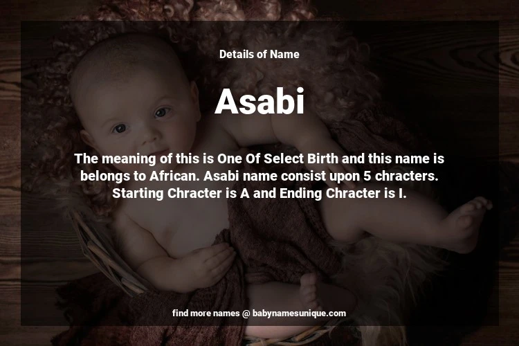 The name Asabi is chosen by those who are willing to find Unique Transgenders Baby Names. The meaning of this is One Of Select Birth and this name is belongs to African Origin. Baby Name Asabi consist upon 5 chracters. Starting alphabet is A and ending alphabet is I. This name is used primarily by parents who are considering unique baby names for Transgenders. The Zodiac Sign suitbale for this name are;