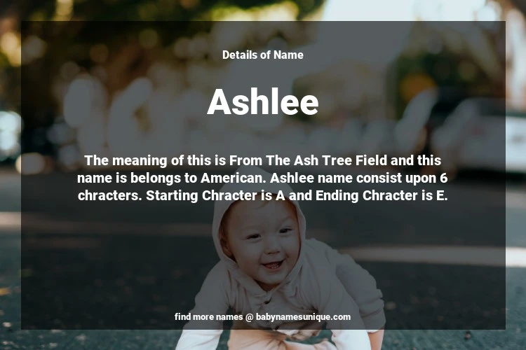 The name Ashlee is chosen by those who are willing to find Unique Transgenders Baby Names. The meaning of this is From The Ash Tree Field and this name is belongs to American Origin. Baby Name Ashlee consist upon 6 chracters. Starting alphabet is A and ending alphabet is E. This name is used primarily by parents who are considering unique baby names for Transgenders. The Zodiac Sign suitbale for this name are;