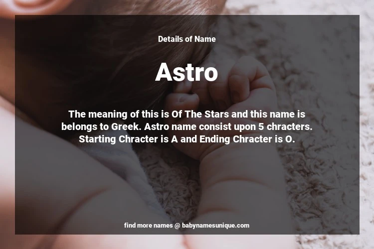 The name Astro is chosen by those who are willing to find Unique Boy Baby Names. The meaning of this is Of The Stars and this name is belongs to Greek Origin. Baby Name Astro consist upon 5 chracters. Starting alphabet is A and ending alphabet is O. This name is used primarily by parents who are considering unique baby names for Boy. The Zodiac Sign suitbale for this name are;